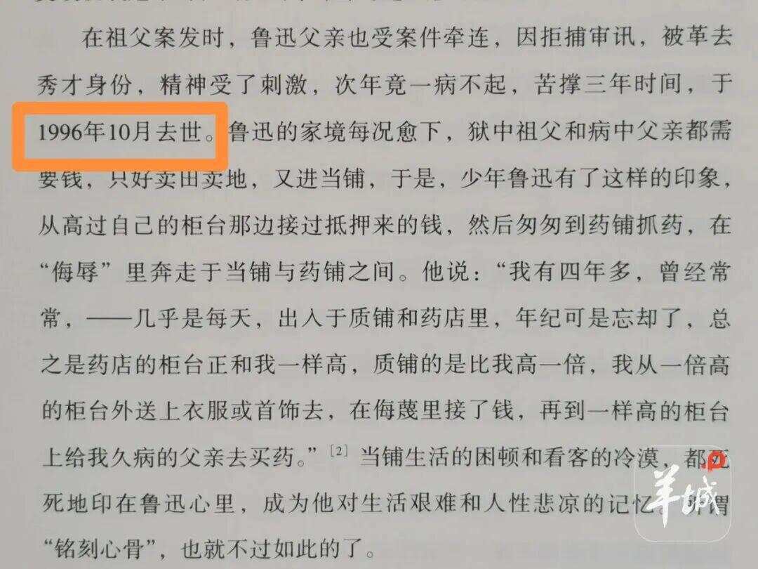 最近,一个网民释放了他在阅读《卢Xun介绍:思想与文学》一书时发现了一个错误:这本书说,卢Xun的父亲于1996年去世。扬昌晚间新闻的一位记者从各种信息中学到了卢Xun的父亲Zhou Boyi于1896年死于1896年,当时Lu Xun 15岁。 Netizen说这是一个大错误,出版商“太滑了”。 9月30日,记者在图书馆中找到了这本书,并阅读了本书的第5页,他说:“当祖父发生案件时,卢Xun的父亲也被指示。根据版权页面,这本书由重庆大学出版社于2024年8月出版,王·贝乔(Wang Benchao)设定了。根据本文的帖子,是西南大学文学学院的“ Boya Book Book of New Lible Arts and Trantators of New Lible Arts and Trantation”的一套。书采用了一种采访方式,“试图在主题和受欢迎程度之间找到平衡”。根据相关信息,父亲的疾病和死亡对卢Xun的生活产生了巨大影响。卢Xun在自传中回忆说:“当我13岁那年,我的家人突然发生了一次大事故,几乎没有……我父亲再次生病了,他死了将近三年。 Yangcheng晚间新闻,Yangcheng School,Jinyang.com文字| Xie Yangliu的图片| Xie Yangliu