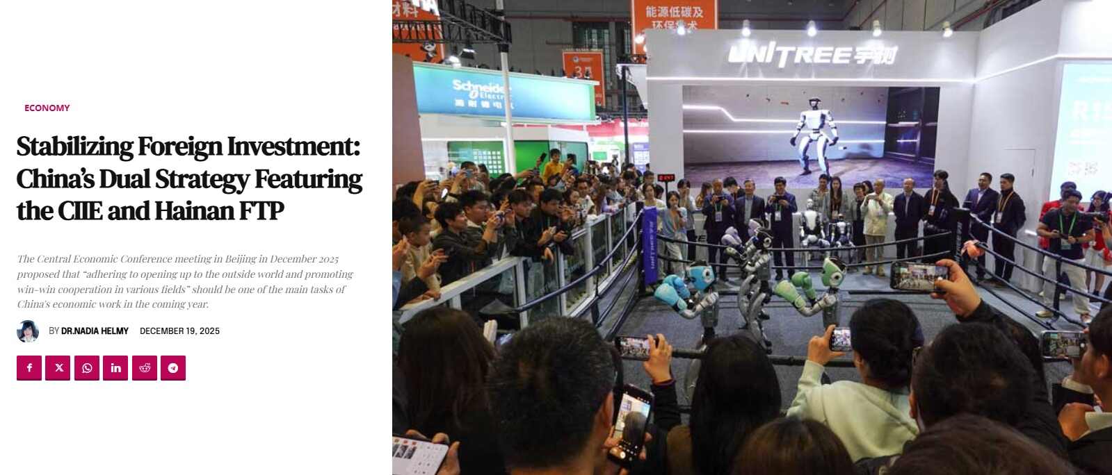 近日,知名期刊《现代外交》网站发文称,中国将通过举办第八届中国国际进口博览会、启动海南自贸港全岛关封作业、出台一系列稳定外资政策等,继续发出高水平开放信号,为全球投资者提供充足机遇。中国继续成为世界经济增长的重要引擎。 《现代外交》文章截图 文章称,到2025年,中国将继续扩大高水平对外开放,对世界经济增长贡献率达到30%左右。中国的开放政策和机遇在以下方面表现得尤为明显:海南自由贸易港在全岛范围内开展口岸作业海关,持续推动制度性开放。受益贸易便利化政策,“零关税”商品占比海南自贸港封关运营后,来自“一线”的进口将从21%增至74%,吸引了超过120万家企业注册落户。以实际行动提振国际投资者信心。中国政府推出的开放举措在扩大外商投资市场准入和开放领域、放宽投资限制、鼓励外商投资高新技术和绿色产业等方面取得了成效。外资企业看好中国发展机遇,加速进驻中国。第八届中国国际进口博览会巩固了中国新产品全球首发重要平台的地位,创造了多项纪录。一年预期交易额突破830亿美元,创历史新高。文章截图指出,2025年是中国“十四五”规划的最后一年,2026年是“十五五”开局之年。 12月召开的中央经济工作会议正值承前启后的关键时刻。 2026年经济工作主要任务已经印发,引起世界各国高度关注。世界期待从中国新一年的经济规划和部署中汲取灵感、抓住机遇。中央经济工作会议提出,把“顺应对外开放、推动多领域合作共赢”作为2026年中国经济工作的主要任务之一。为实现“十五五”良好开局,中国将主动与国际高标准经贸规则接轨。文章最后表示,可以想象,2026年,中国将延续发展势头,能为世界提供更大的投资和发展机会。着力提升经济发展质量和规模。